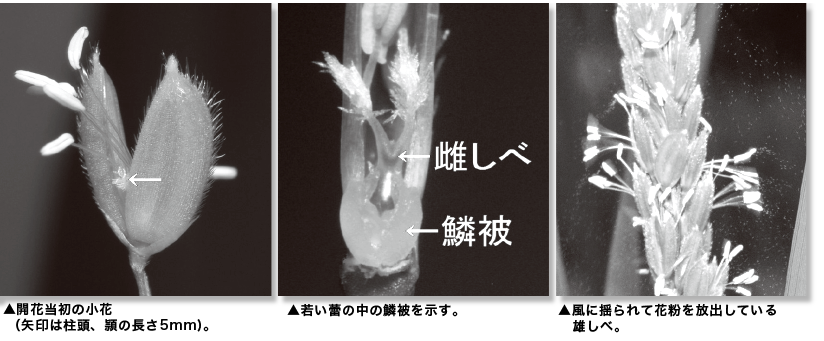 イネ科植物の多くの種の花は雄しべを3 本ずつもつている。しかし、イネは自らの名を冠するイネ科の植物なのに、例外的に雄しべを6 本も持っているのだ。例外的と書いてしまってから、本当に例外的か否かを知るため、長田武正(1989)「日本イネ科植物図譜」の記載や図で雄しべの数を調べてみた。この図鑑には300 余種のイネ科植物が掲載されており、その3 割ほどの95 種で雄しべ数が示されていた。計数した結果、1 小花あたり雄しべを3本もつ種は73 種(77%)、1 −2 本は19 種(20%)、そして6本あるのはイネを含めて3 種(3%)にすぎなかった。やはり例外的だと言えよう。